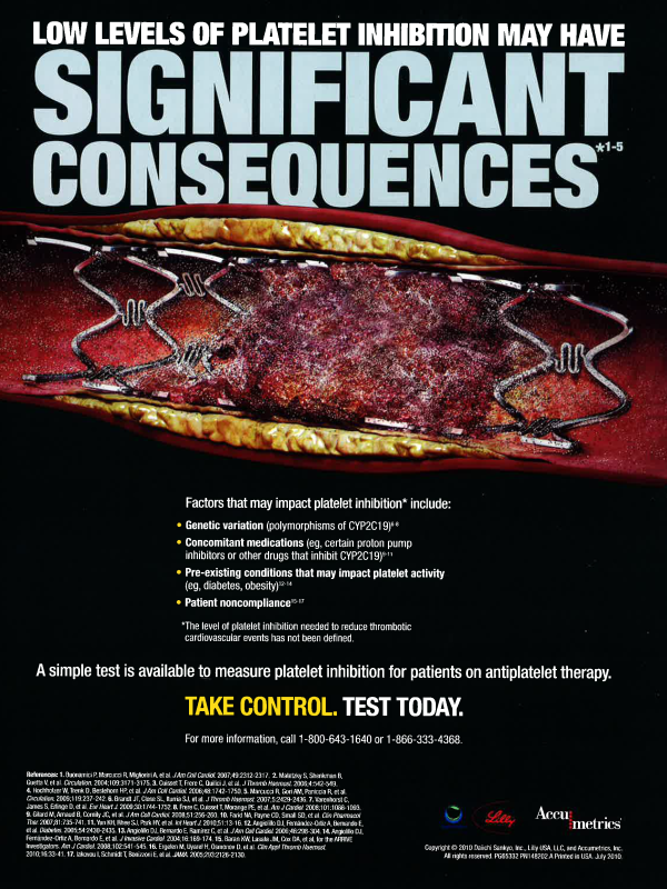 The ad then asserts, “A simple test is available to measure platelet inhibition for patients on antiplatelet therapy.” In a larger font is the exhortation “TAKE CONTROL. TEST TODAY.”