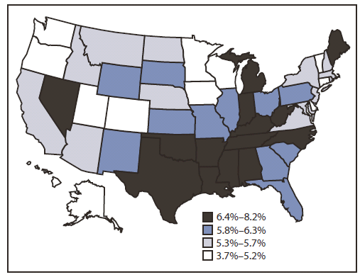 CHD prevalence was generally highest in the south. In 2010, Hawaii and Washington, D.C., had the lowest prevalence (3.7% and 3.8%), while West Virginia and Kentucky had the highest (8.0% and 8.2%).