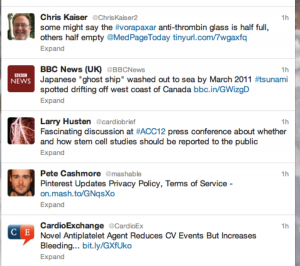 There are a variety of reasons given for this, the most popular one being that the poor economy is effecting both academic institutions and private practitioners. People also argue that there are simply too many meetings these days, especially as the field has become more subspecialized. Finally, the immediate digital availability of these conferences. A snapshot of my Twitter feed from an hour ago demonstrates that you can get a pretty good idea about the results being presented in real time: