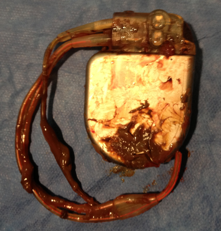 Inside the pulse generator pocket was the device and lead system, surrounded by thick, odorless fluid that looked, for lack of a better phrase, like wet, brown mud. After the suture holding the device’s header to the pocket wall was cut, the device was extracted from the pocket. A portion of the lead was also cut and removed. Here is a picture of the removed device: