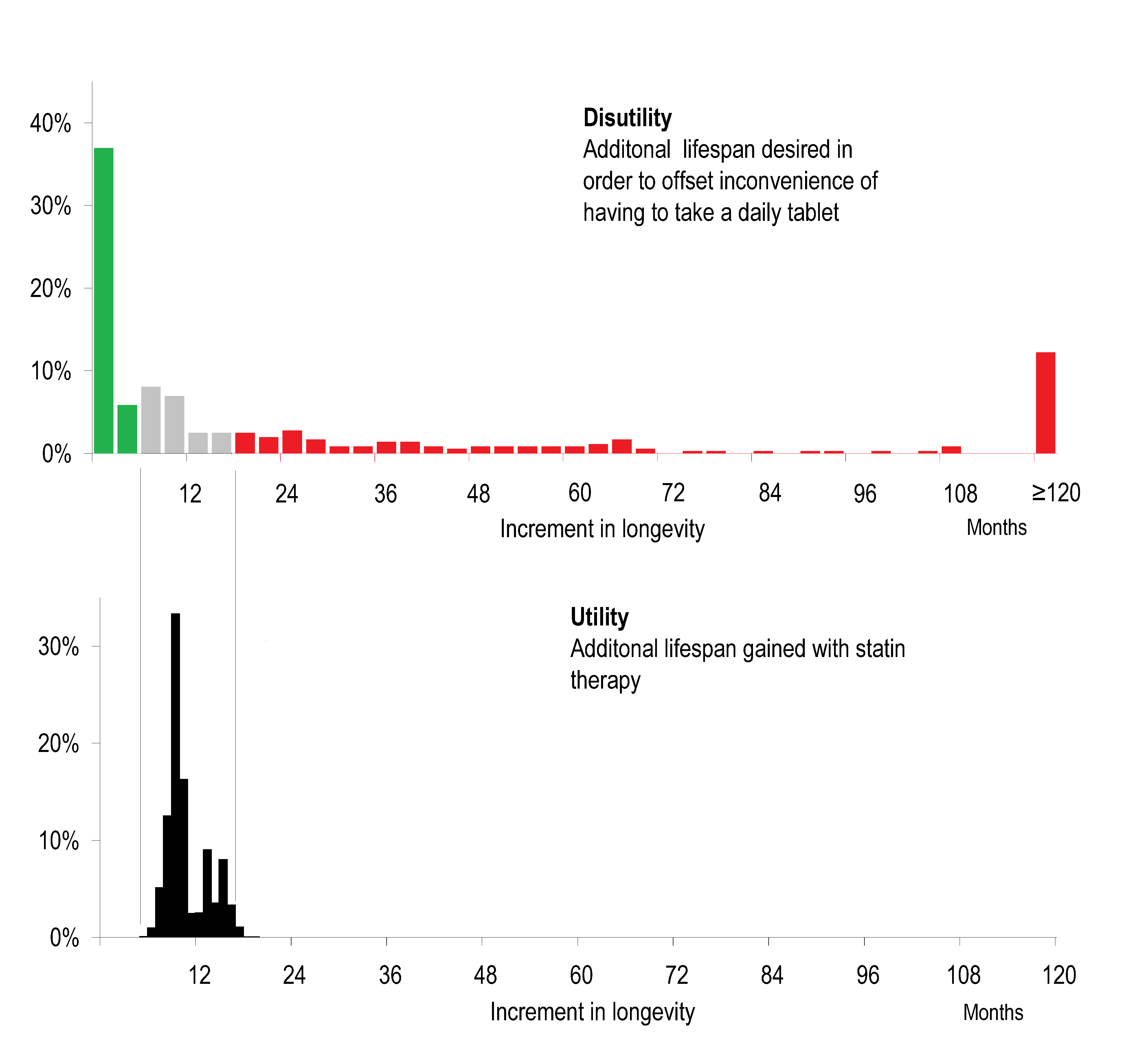 Figure 2. Juxtaposition of distribution of disutility (dislike of taking regular medication, upper panel) against distribution of utility (life expectancy gain from taking a statin, lower panel) in the general population. For patients with low disutility (green), regardless of their level of risk factors (and therefore utility) it appears rational to take preventative medication. For patients with high disutility (red), regardless of their level of risk factors, disutility seems to exceed utility. For the patients in between (the grey zone), the net effect of utility and disutility depends on their individual level of risk factors. Expressing both utility and disutility on a common scale, of extra life expectancy obtained or demanded, permits them to be juxtaposed easily and discussed openly. Redrawn from data in our paper, Fontana et al, Circulation 2014.
