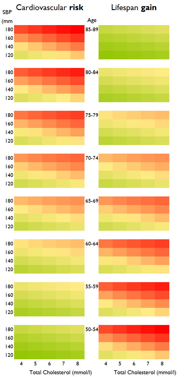 In our study we calculate not cardiovascular risk but life expectancy (i.e., lifespan) gain from a primary prevention intervention such as a statin (Figure 1). The pattern of life expectancy gain seems at first familiar, with increasing blood pressure and cholesterol associated with higher values (redder colors), but it has one crucial difference: Cardiovascular risk increases with increasing age, but life expectancy gain from statin initiation reduces with age of initiation. Initiating a lifetime of statins adds more to life expectancy if it is done earlier than later.