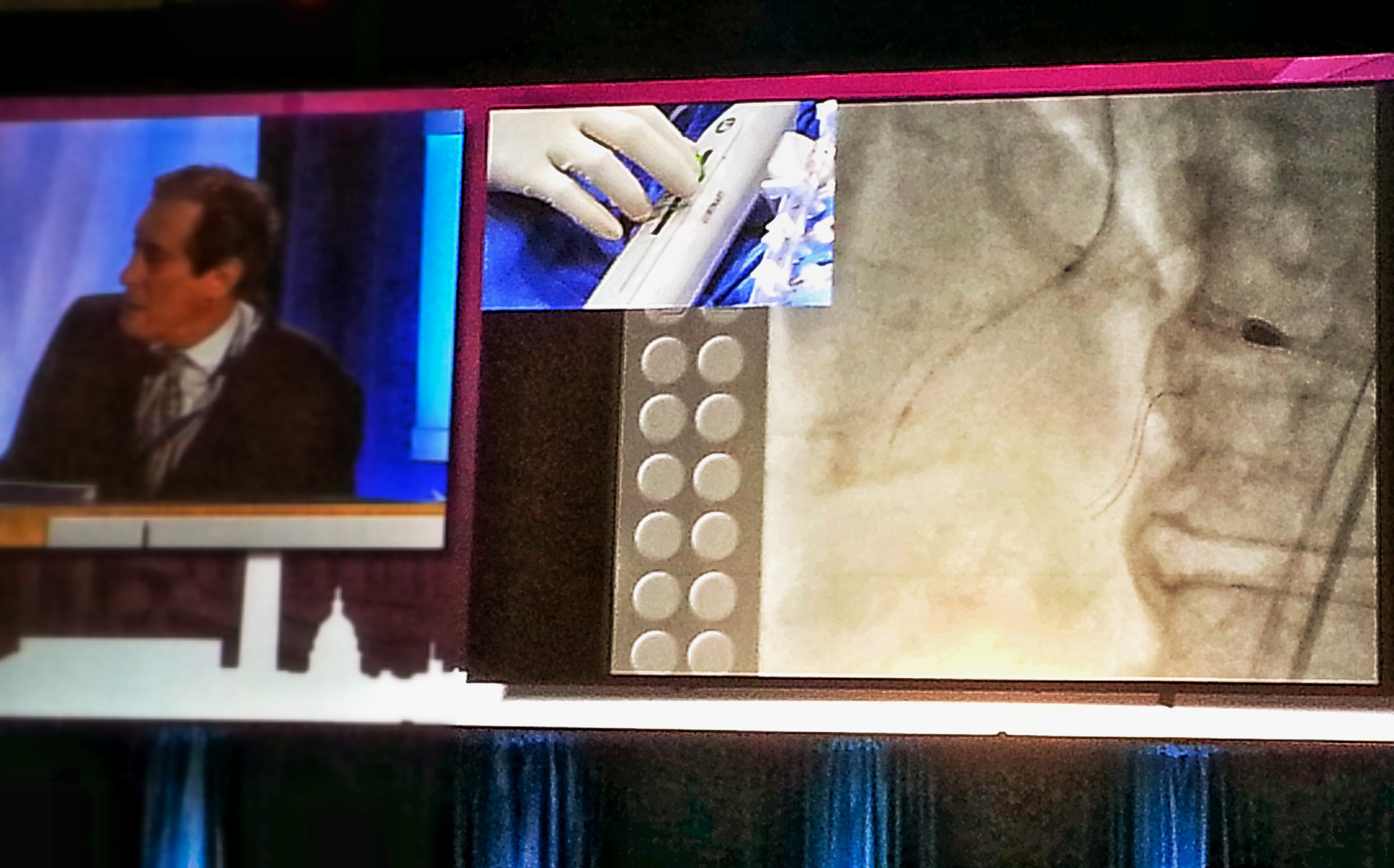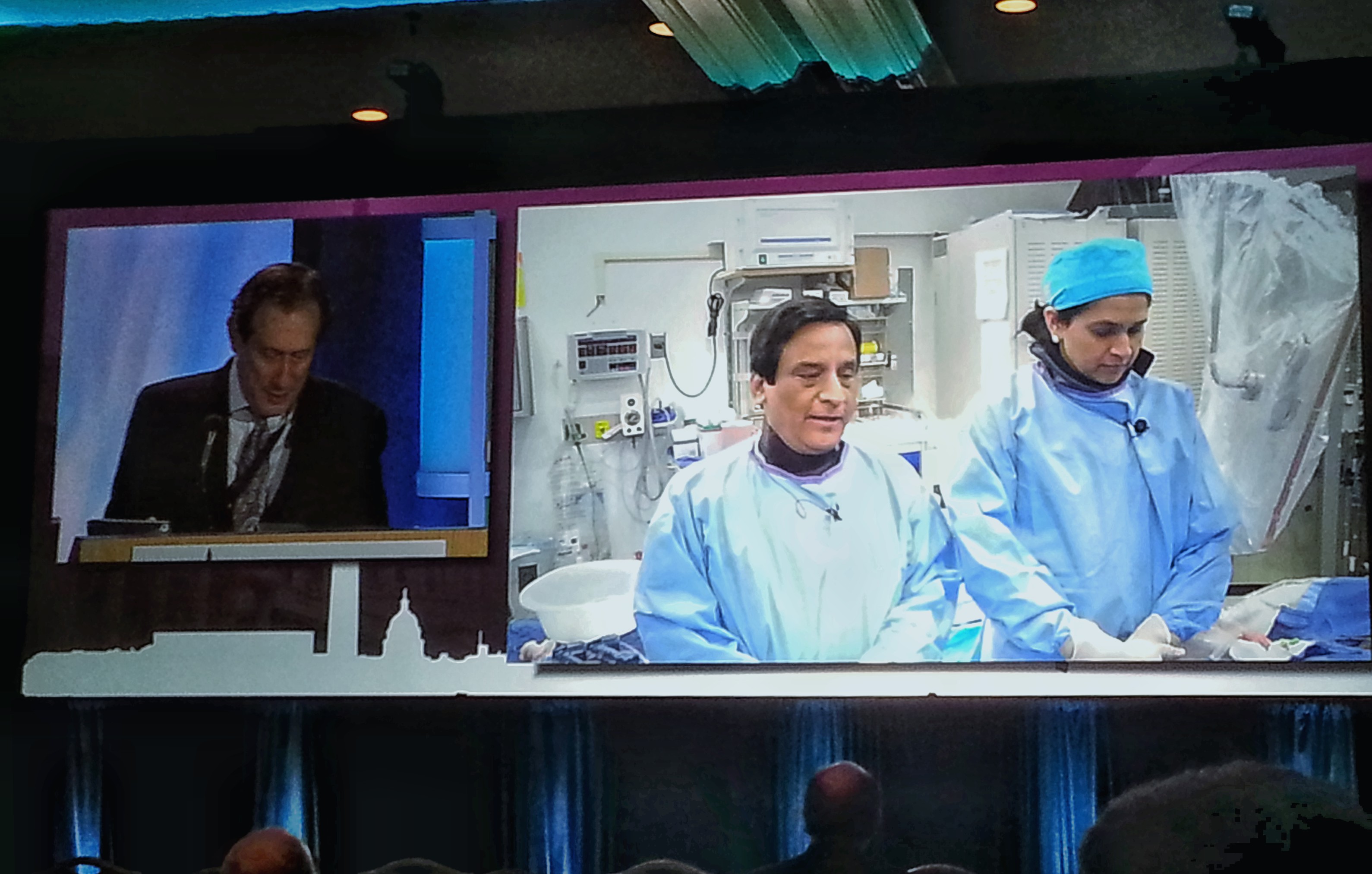 The live demonstration — on two large high definition (HD) projection screens — was performed by Drs. Samin Sharma and Annapurna Kini and colleagues at the Mt. Sinai cath lab (on the right screen in the photograph below), with preparatory educational slides (on the screen to the left), consistent with the pre-existing live case format available to the community on the Mt. Sinai website (e.g., coronary cases and peripheral cases).