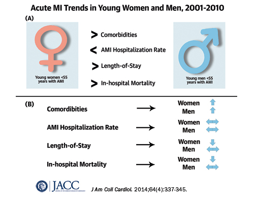 Even though more than 30,000 women less than 55 years of age suffer from acute myocardial infarction (AMI) every year in the US alone, young women remain a vulnerable, yet understudied group with worsening cardiac risk profiles and worse outcomes as compared with men. Our study, published recently in JACC, shows that these healthcare disparities in cardiovascular disease are persistent, although have a favorable trend. Three points about AMI in the young to take away from this study are as follows: