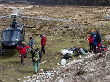 We awoke the next morning, a little before 6 AM, to the sounds of helicopter traffic heading up the valley. We received word that all of the critically ill and wounded from Everest Base Camp would be evacuated to our facility, and we quickly began preparing for the possibility of significant patient volume. This is exactly the type of mass casualty situation that my emergency medicine and wilderness medicine training prepared me for. Our clinic has two inpatient beds, one consult room bed, and another extra bed in our research room. Our physician staff includes me, Andrew Nyberg from the U.S., and Katie Williams from the U.K. Meg Walmsley from Australia, one of the Everest ER physicians, descended via helicopter that morning to assist with the large patient influx. Gobi Bashyal, our clinic manager, leaped into action and began making phone calls to the surrounding areas and country officials to obtain the necessary manpower and helicopters, while Thaneshwar Bhandari, our assistant manager, began assisting us with preparations. We quickly mobilized the sunroom into a patient facility, and the owner of the Panorama lodge next door, whose lodge was one of just two that had been unaffected by the quake, graciously donated his dining room. We received approximately 10 critically ill patients first and placed them in the clinic and sunroom — many on makeshift beds placed on the floor. There was a mix of Nepalis and international patients. Approximately 20-30 more suffered major injuries and were unable to ambulate. I cared for the most critically ill patients in the clinic and sunroom. In total, we saw and evacuated an estimated 73 patients, including many “walking wounded.” We utilized disaster training and placed large white stickers on patients with their names, injuries, vital signs, and medication administration times. Our resources here include intravenous fluids, medications, and ultrasound. However, we are a remote post without access to blood products or the ability to perform subspecialty procedures that many patients required. Luckily, the weather cleared, and we were able to arrange further evacuation down to the hospital in Lukla, which had more resources. Numerous helicopters, including an MI-17 — which could hold 16-18 patients — made many trips as all patients were evacuated over a 5-hour period.