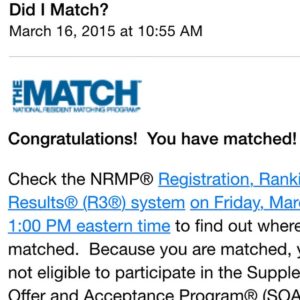 Match Day. The one day that medical students across the United States all simultaneously look forward to and also fear. It’s really a whole week of roller-coaster emotions: on Monday we find out if we matched somewhere, and on Friday we find out where. (And, in between, if we unfortunately didn’t match, we scramble to find a position that is hopefully what we wanted to do but that at least gives us a job for the next 1-7 years.)