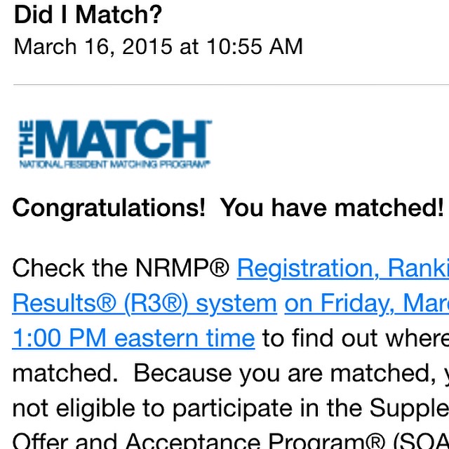 My Match Day as a student was a complete collection of all emotions. I was excited to see where I was going to train for the next 3 years, really hoping it would be at the same place my husband was going, and scared to find out. Scared because, if we didn’t end up at the same place, the 1 year of training in separate cities that we’d already done could end up being 3 or 4 years of living apart. And very nervous that, if all went well, we’d be moving halfway across the country to city where we didn’t know anyone.  I remember very nervously walking up to the stage with my husband to get my envelope, opening it with him, and then turning to the microphone to announce where I [we] was going. (My husband, clearly, was very excited that we were going to the same place for the following 4 years.) I remember cheering on my classmates and friends as they found out where they were headed to for the next stage of their training. Some were ecstatic with their matches, and a few were mildly disappointed, but everyone was proud that they had made it to the next step.