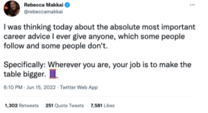 Last but not least: root for others to succeed. There is enough success in the world for everyone. One of my favorite Twitter threads by author Rebecca Makkai outlines this idea beautifully. Even though she specifically talks about the arts, this idea absolutely applies to the world of academia.