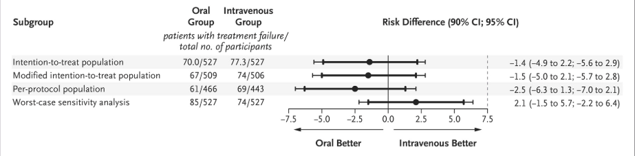 OVIVA: Here’s the big news: Oral therapy was clearly non-inferior to IV. Definitive treatment failure at 1 year occurred in 13% of the oral group and 15% of the IV group. These results held up in several sensitivity analyses, including something we called a “worst case” outcome. In this approach, we take the participants with missing data, and assume all these participants who were randomly assigned to receive oral therapy and no participants who were randomly assigned to receive intravenous therapy had definitive treatment failure. This introduced the worst possible bias against the oral strategy — and it was still non-inferior. Here, take a look at this figure:
