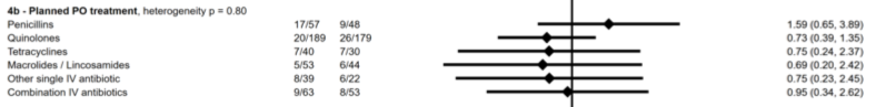 Me: Understood. But here’s another way of looking at the results — if clinicians generally select highly bioavailable oral antibiotics for treatment of bone and joint infections, then oral is non-inferior to IV. This might be overinterpreting the subgroup analysis, but the forest plot for planned oral treatment even hints at this conclusion: