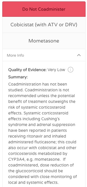 What about mometasone? UpToDate has an easy-to-use drug interaction program, and it showed no significant interaction. However, the invaluable University of Liverpool HIV Drug Interactions checker disagreed, and did so strongly (that’s their report to the right).