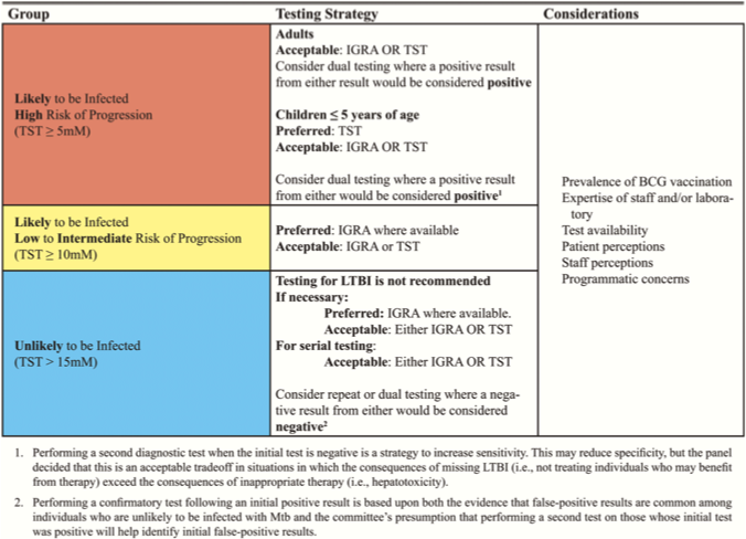 In TB screening, do you have a preference for using either an IGRA or a skin test? In general, the IGRA (interferon gamma release assay) is better — less operator dependent, no second visit required, no false positives from BCG. While the IGRA is more expensive, its advantages over tuberculin skin testing were acknowledged in the latest guidelines, which stated that the IGRA is generally preferred when available. See the summary table at right (click on image to see it larger).- I take care of a nurse who got Tdap last year, and was recently exposed to pertussis. Should she get preventive antibiotics? It would be great if we knew the degree of pertussis protection afforded by the Tdap vaccine after a direct exposure, but unfortunately those data are limited; in addition, secondary cases of pertussis have occurred within households even when immunizations are up to date. As such, it’s recommended that most healthcare workers receive antibiotic prophylaxis after exposure to a case, as they may come in close contact with people at high risk of severe illness from pertussis.
