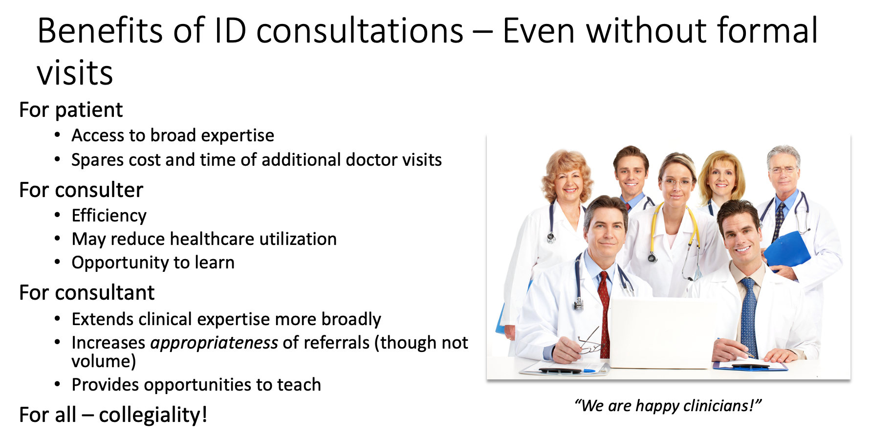 It’s a topic near and dear to my heart, so much so that I have an entire talk on this subject that starts with several slides outlining both the benefits and the risks of this practice. And for the hard-liners (see photo above on the right) who never do clinician-to-clinician advice without seeing the patient, trust me there are benefits, some of which I’ve summarized on this slide from my talk: