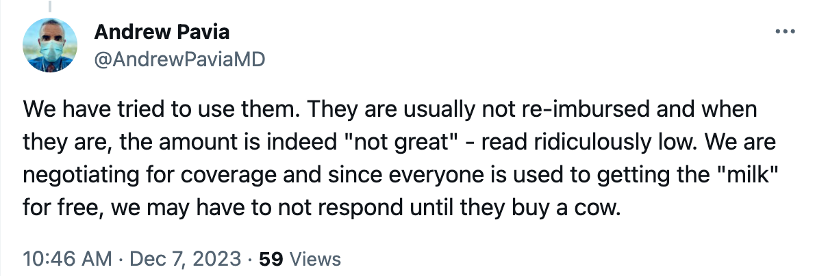 I do not believe that “nobody has figure how to reimburse this”. On the contrary, “they” know we save money to the “system” doing this, “they” just want to pay little or ideally nothing. In fact “they” figure initially that 50 back was Ok, but then “they” kept it flat, because they can get away with this.