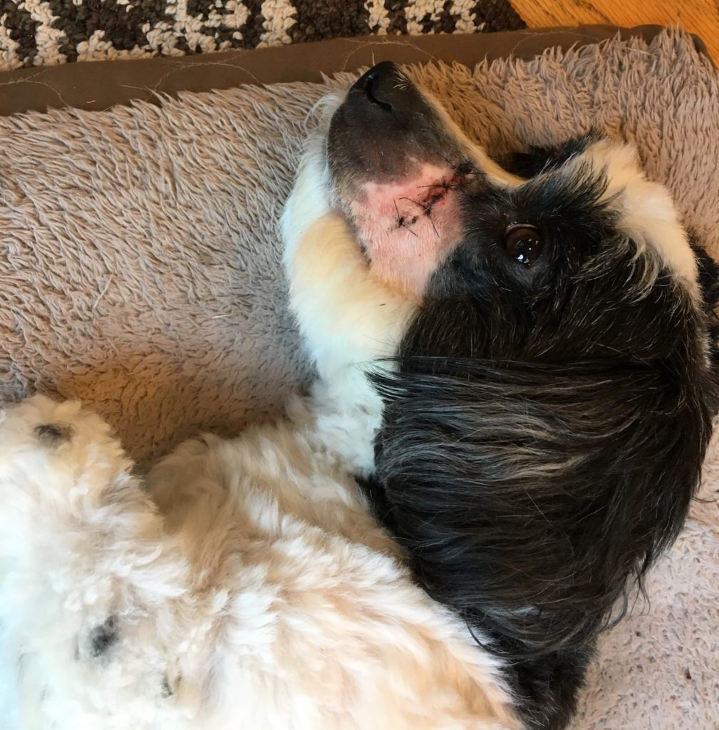 We took him to the local animal hospital. They admitted him, put him under anesthesia so they could wash out the wound, closed it in two layers with four stitches. Many hours later they discharged him home to us, his very distressed owners.