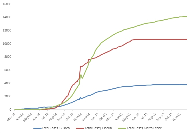 - New Ebola virus disease cases and deaths have dramatically declined. I write that sentence with some trepidation, as cases continue to occur sporadically, and this late relapse in a nurse was a chilling reminder of how little we know about this disease. Additionally, since what caused the massive outbreak in Western Africa is still poorly understood, complacency about Ebola would be very ill-advised. Nonetheless, the reason we should be grateful is shown clearly in this figure of Ebola incidence: