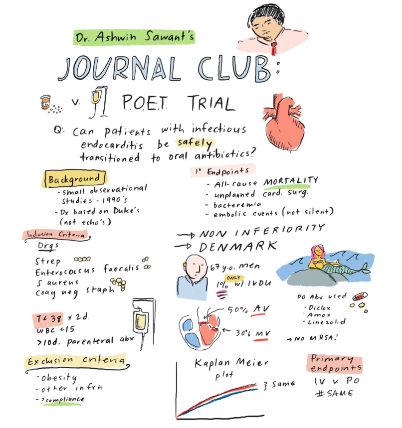 - It is becoming increasingly clear that oral antibiotics can substitute for intravenous in almost every situation. In the much-discussed POET study, stable patients with endocarditis who completed treatment with oral therapy did just as well as those who completed treatment with IVs. (And here’s a big thank you to Dr. Grace Farris for allowing us to use her wonderful journal club cartoon.) In another study, linezolid — price dropping rapidly — was a fine option for completing treatment in uncomplicated Staph aureus bacteremia. OVIVA study, where are you?