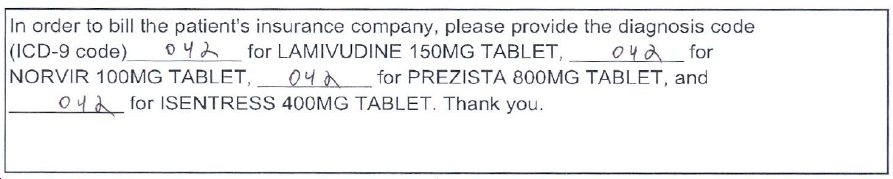 Here, confronted with the challenge of refilling a patient’s HIV medications — which for the record he has been receiving unchanged for over 3 years — the pharmacy decides for the first time to reject the request and send the prescription back to us (by fax of course), including a cover sheet that reads, “Required Information Missing — Pls complete ASAP.”