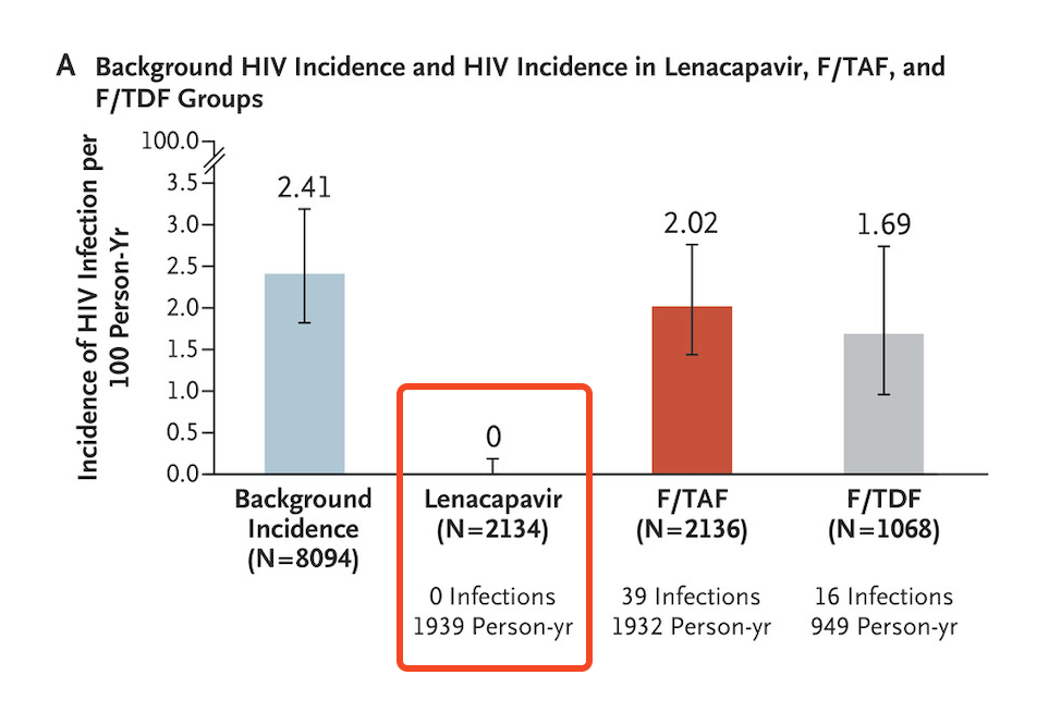 - The primary and secondary end points were of great interest. Note that in addition to lenacapavir being superior to both no PrEP (background incidence) and TDF/FTC, the study also showed that TAF/FTC and TDF/FTC were not meaningfully different and that TAF/FTC only provided protection with good adherence — which was unfortunately not common among those assigned to oral therapy. (The efficacy of TDF/FTC was not a defined endpoint.)