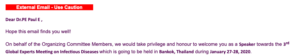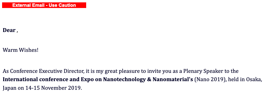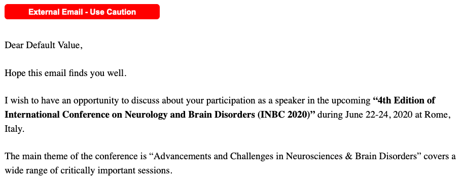 On to invitation number three, which represents the very pinnacle of personalized conference invitations. It comes from a “Dr. Irene Frank”, whose title is “Executive Director, Coalesce Research Group”. They’re based in Greenville, South Carolina, in case you were wondering.