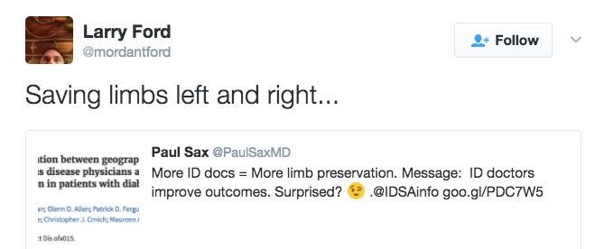 - The more ID doctors living in a region, the more likely a patient will avoid amputation for diabetic foot ulcers. I like the fact that the authors used “geographic density” of ID doctors, as this accounts for both formal ID consults and the informal advice given to clinicians, something we do frequently. How to summarize this benefit? Here’s one amusing way: