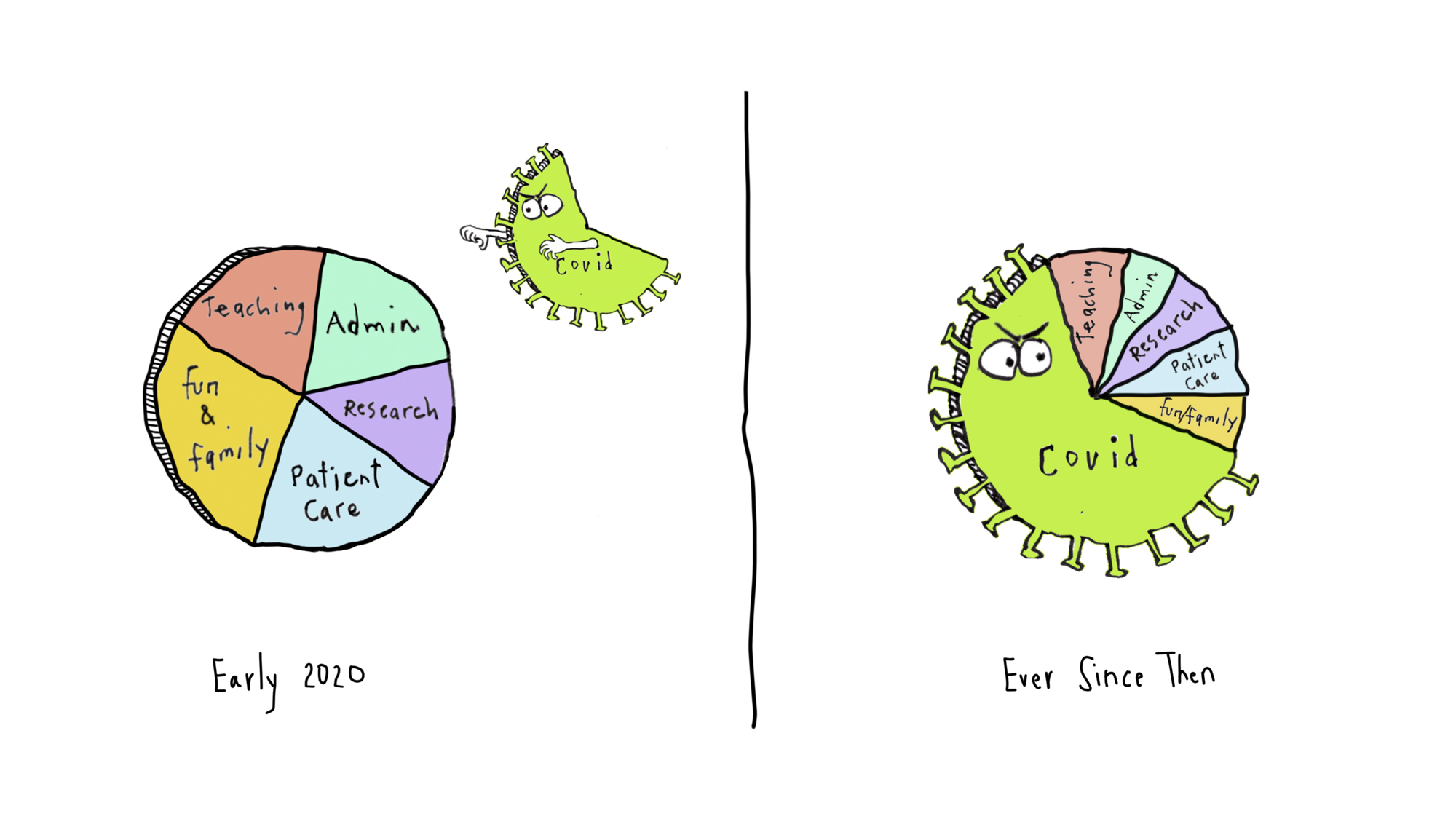 I tried to explain it by saying that our usual distribution of work and non-work activities are constantly barraged by this big bully, COVID-19. If you picture your life as a pie chart, with each slice representing how you spend your time, along comes this scary, gigantic brute shoving everything else aside and making the rest of your life experiences and activities that much smaller.