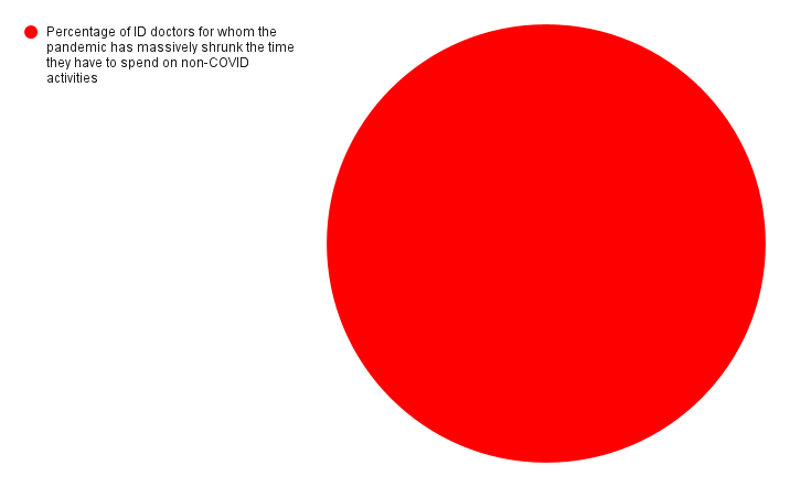 But I can guarantee what another pie chart looks like. It’s shows the percentage of ID doctors for whom the pandemic has massively shrunk the time they have to spend on non-COVID activities.