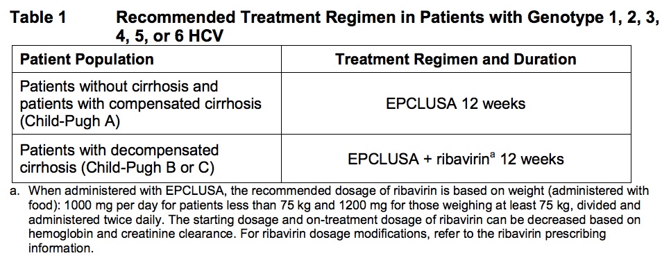 But a quick glance at the clinical trials data and the sticker prices shows that VEL/SOF could easily become the recommended treatment for genotype 2 (good riddance, ribavirin!) and genotype 3. For the latter, this is not only based on price; sofosbuvir plus daclatasvir needs to be given for 24 weeks, with ribavirin, in all genotype 3 patients with cirrhosis. So VEL/SOF really is an advance — this is a simple, safe, and effective 12-week treatment for all genotypes that will rarely need ribavirin, except when there is decompensated cirrhosis (Child-Pugh 2 or 3).