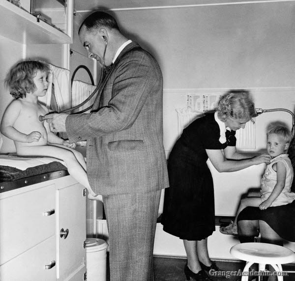 A doctor and nurse examine children in a trailer clinic at a mobile camp in Klamath County, Oregon. Photograph by Dorothea Lange, October 1939.