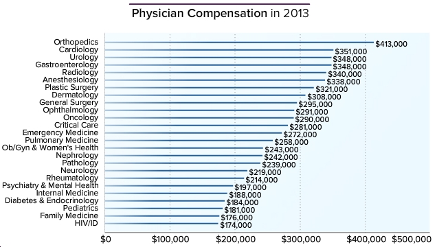 Here’s a figure from Medscape listing 2013 physician compensation: